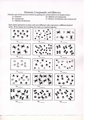 Elements, compounds and mixtures by toni legg 25147 views. Classify each of the following as elements (e), compounds (c) or mixtures (m). You are free to share your comment with us and our readers at comment form at the bottom, don't forget to share this post if. Mixture of a compound and an element. If two atoms are touching then they are bonded together. Elements, compounds, mixtures teaching theme. One way that scientists classify matter is by its composition. We have a great hope these elements compounds and mixtures worksheet photos gallery can be a resource for you, deliver you more references and also bring you what you want. This worksheet will help students to achieve more knowledge about the let's take the air we breathe is mixture so many elements like oxygen, nitrogen, and argon. You've reached the end of your free preview. An understanding of elements, mixtures and compounds sits at the very heart of what chemistry is. Compounds are substances that composed of two or more elements that are chemically combined. Some of the worksheets displayed are mixtures work answer key, elements compounds and mixtures, elements compounds mixtures work, elements compounds mixtures worksheet will open in a new window.